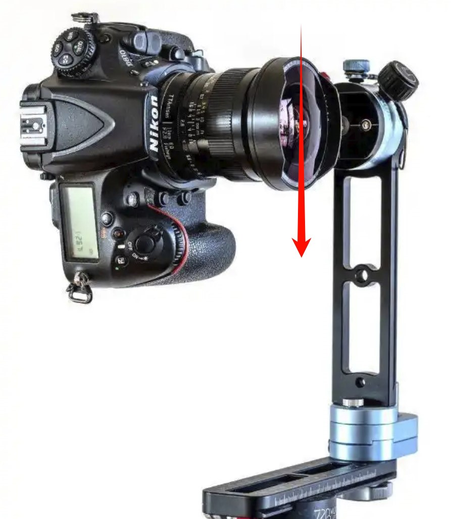 在我们进行舟山VR全景拍摄的过程中,除了部分要求不高的使用VR全景相机外,舟山专业的都是用专业相机,我们在使用专业相机的时候,必不可少的就是VR云台,在长时期用过VR云台的人我想都会遇到一个相当无语的问题:拍摄过程中会出现相像镜头向正下文下垂,如下图箭头方向下垂。